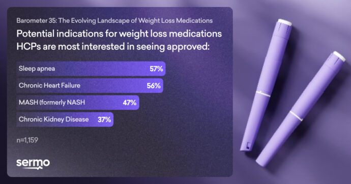 New York – The 35th Barometer from Sermo, a fast, frictionless HCP social engagement platform and leader in healthcare insights, revealed that healthcare providers (HCPs) are most eager to see GLP-1 medications be approved to treat sleep apnea. The Barometer surveyed 1,150+ global healthcare providers across specialties on their experience prescribing weight loss medications. In addition to sleep apnea, HCPs were most interested in seeing GLP-1 medications approved to treat chronic heart failure and MASH (formerly NASH).