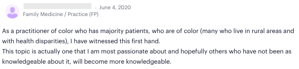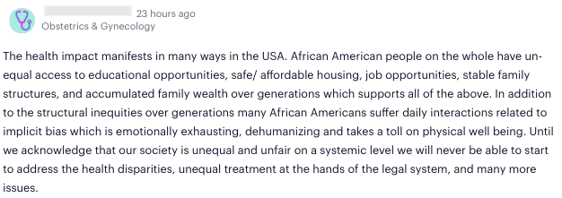 In a recent Sermo poll, 70% of physicians said that both police violence and the disproportionate impact of the coronavirus on communities of color have shed light on stark health disparities. And 72% believe that systemic violence requires a systemic response. When asked about their personal observations, 61% of physicians said they have seen first-hand that racism can have a negative impact on a patient’s health; and 33% have seen patients die due to racism—either directly or indirectly from health conditions brought on by racism.