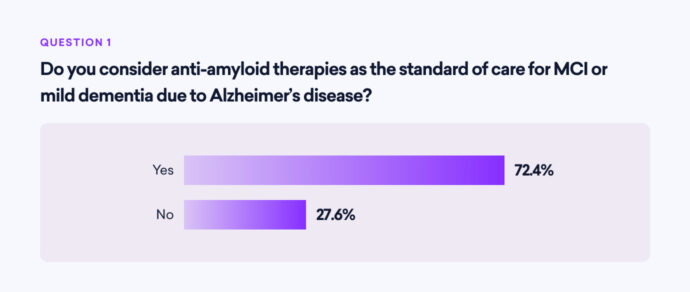 A significant majority of neurologists globally (72%) consider anti-amyloid therapies to be the standard of care for patients with mild cognitive impairment (MCI) or mild dementia due to Alzheimer’s disease. This marks a substantial shift towards these therapies. However this majority is much slimmer in the US where only 59% of neurologists considering them a standard of care versus 41% who do not – suggesting that patients would receive very different care depending on which neurologist they went to.