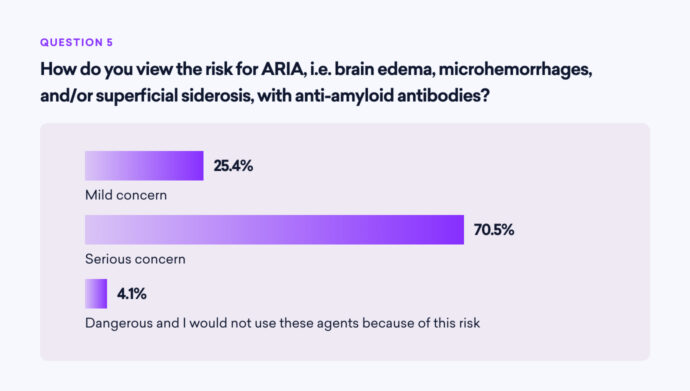 A significant concern among neurologists is the risk of Amyloid-Related Imaging Abnormalities (ARIA), which includes brain edema (ARIA-E), microhemorrhages, and superficial siderosis (ARIA-H). 71% view the risk for ARIA as a serious concern, specifically: