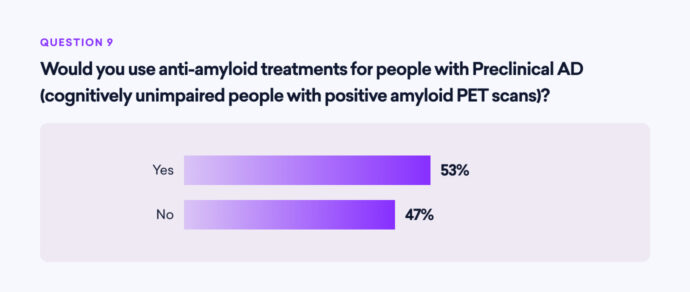 60% of the surveyed neurologists believe these biomarkers are accurate enough to confirm an Alzheimer’s disease diagnosis today. This is indicative of advancements in diagnostic technology, which may lead to earlier and more reliable detection of the disease. However, only 5% of neurologists viewed them as a marker of clinical benefit (more on this below).