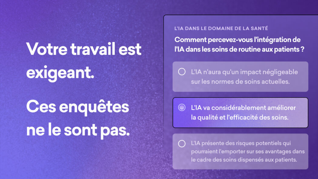 Lorsque les médecins participent aux enquêtes, ils font part d’observations importantes qui aident les organismes de santé à définir les développements futurs. En retour, ils s’informent sur les nouveaux produits susceptibles de bénéficier à leurs patients, tout en recevant une rémunération. Les médecins se tiennent informés des solutions de pointe et apportent des points de vue qui permettent d’améliorer directement les soins dispensés aux patients. Tout le monde y gagne.