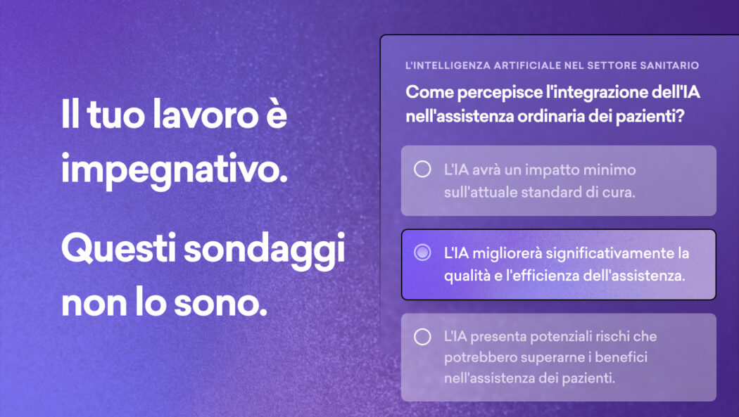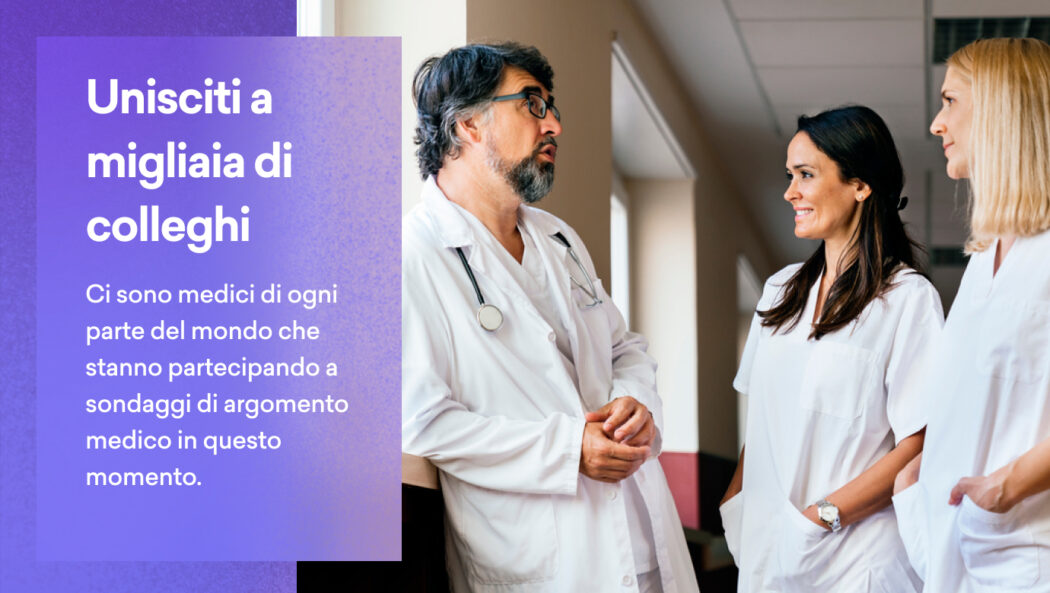 Quando i medici partecipano ai sondaggi, condividono osservazioni importanti che aiutano le organizzazioni in ambito medico-sanitario a plasmare gli sviluppi futuri. In cambio, apprendono informazioni su prodotti in fase di sviluppo o recentemente immessi in commercio che possono beneficiare le loro popolazioni di pazienti, ricevendo nel contempo un compenso. I medici rimangono informati sulle ultimissime soluzioni terapeutiche e forniscono considerazioni che possono direttamente migliorare l’assistenza ai pazienti. Si tratta di una situazione vantaggiosa per tutti.