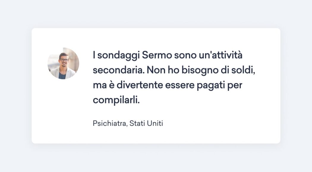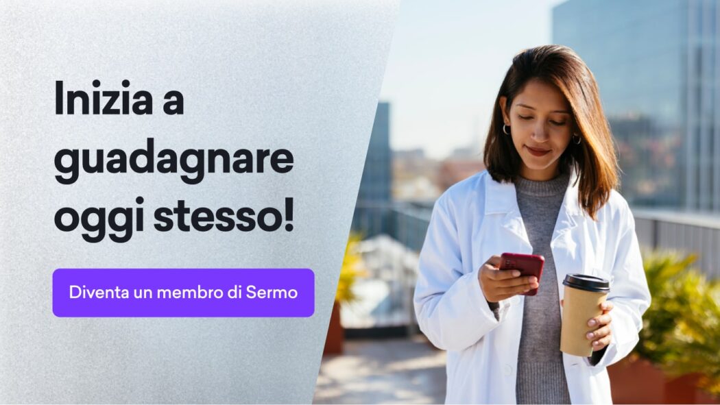 Noi di Sermo vogliamo fornire agli operatori sanitari la possibilità di dare il meglio di sé, ed è per questo che offriamo opportunità di guadagno attraverso i nostri sondaggi retribuiti per medici.