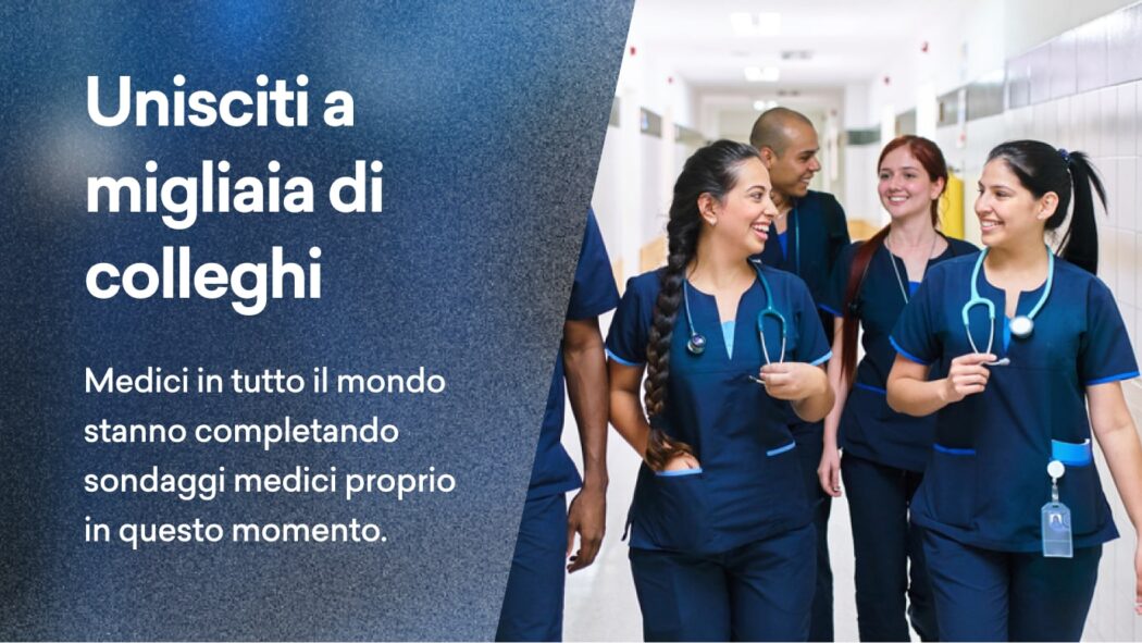 Ogni sondaggio completato non solo fornisce un reddito supplementare ai medici che utilizzano la nostra piattaforma, ma contribuisce anche a un maggiore progresso della medicina e del settore in genere. Le tue risposte ci permettono di raccogliere informazioni reali e tangibili da chi è in prima linea nell’assistenza sanitaria e di utilizzarle per orientare e guidare le iniziative finalizzate al cambiamento. In breve, non ci limitiamo a sfruttare le tue conoscenze e competenze. La nostra missione è migliorare l’assistenza sanitaria per tutti.