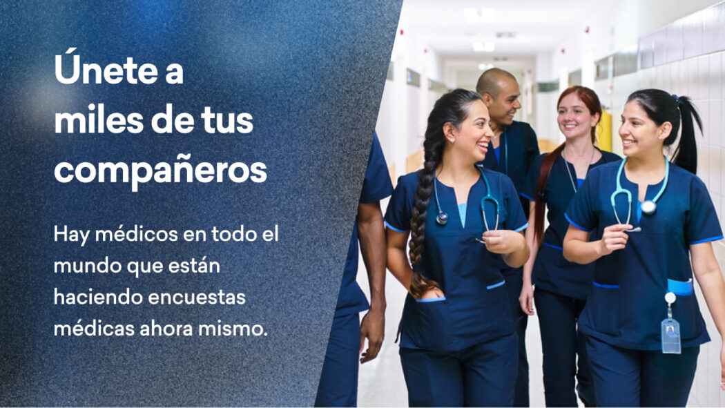 Cada encuesta completada no solo proporciona un ingreso complementario a los médicos que utilizan nuestra plataforma; también contribuye a los avances médicos y a la evolución del sector. Tus respuestas nos permiten conocer una visión real y tangible de la primera línea de la atención médica y esas reflexiones se utilizan para informar y orientar las iniciativas de cambio. En resumen, no solo te hacemos preguntas. Somos parte de una misión para mejorar la atención sanitaria para todos.