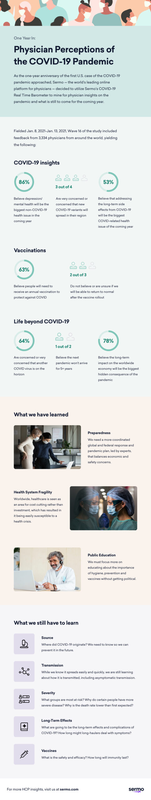 We’ve made it through one year of COVID-19 – but we still have a long way to go. Check out key findings from Sermo’s 16th edition of the COVID-19 Barometer which explores physician perceptions on the pandemic, vaccinations, what we’ve learned, and what we still need to learn as we fight this disease together.