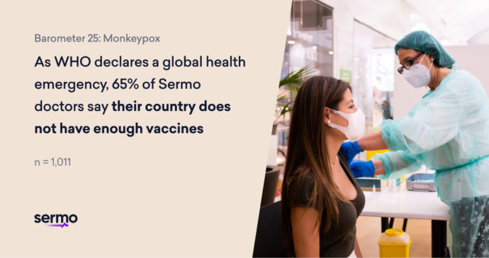 New York, NY – With the spread of monkeypox on the rise and the World Health Organization (WHO) declaring a global health emergency, findings from a recent survey conducted by Sermo, a physician-first online community and leader in global HCP insights, show there is high concern about public misinformation spreading. The survey also found that while 71% of respondents would recommend vaccination as a preventative measure to a patient who was concerned about contracting monkeypox, 65% of doctors say their country does not have enough vaccines.