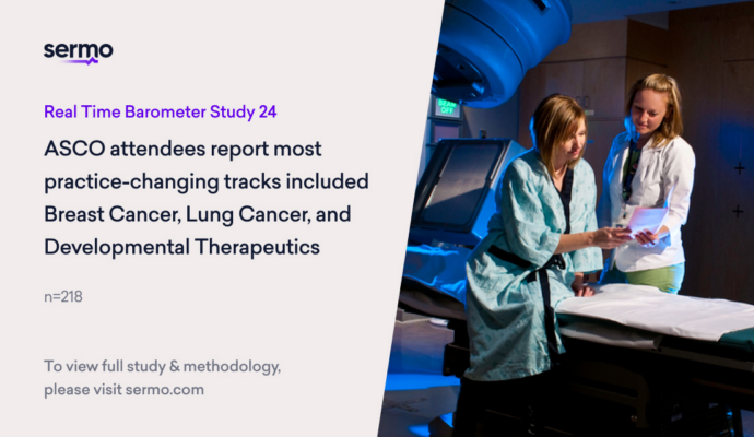 New York, NY – Today, a new barometer survey from Sermo, a physician-first online community and leader in global HCP insights, timed to the conclusion of the annual American Society of Clinical Oncology (ASCO) conference found that the tracks oncologists found the most practice-changing were breast cancer (58%), lung cancer (34%), and developmental therapeutics – molecularly targets agents and tumor biology (32%). Among the breast cancer tracks being followed at ASCO, the DESTINY-Breast04 abstract was the most highly attended with 79% of the surveyed oncologists who were interested in breast cancer data attending this abstract. 43% of oncologists found the data presented in the abstract to be meaningful to their treatment decisions.