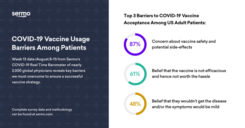 While the effectiveness and safety of vaccines are matters of paramount importance to doctors and their patients, 48 percent of U.S. physicians surveyed reveal their patients don’t believe COVID-19 is a serious concern for them – making this the third most significant barrier to the potential adoption of a vaccine. The survey, called the COVID-19 Real Time Barometer, was conducted by leading physician insights company, Sermo, and is the 13th survey in an ongoing observation study designed to take a comprehensive look at the impact of COVID-19 through the lens of the global physician community.