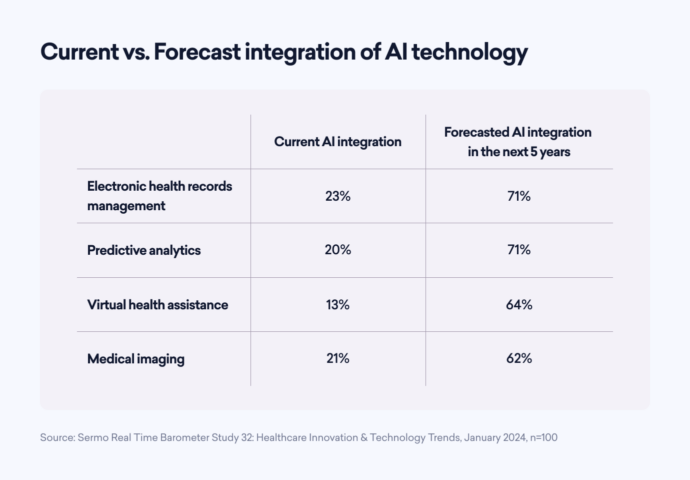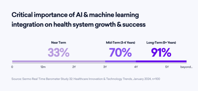 The integration of artificial intelligence (AI) and machine learning in healthcare systems is poised to play an increasingly pivotal role in the next few years. According to the latest findings from the Sermo Barometer study, a remarkable 91% of healthcare leaders hold the conviction that AI and machine learning will be integral components of their organizations’ success in five years or more.