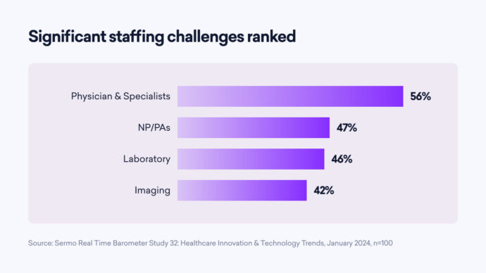 Staffing challenges continue to pose significant obstacles for healthcare organizations. A substantial 56% of respondents report difficulties in recruiting physicians and specialists. The impact of these shortages reverberates throughout healthcare organizations, leading to increased workloads, compromised patient care quality, and burnout among existing staff. Moreover, the inability to fill essential positions hampers operational efficiency and limits the capacity to meet patient demand, exacerbating healthcare disparities and hindering organizational growth.
