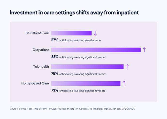 In 2024, healthcare organizations are bracing for significant shifts in care delivery models, with a strong emphasis on expanding outpatient, telehealth, and home-based services. The Sermo Barometer study reveals that an overwhelming 83% of respondents anticipate increased investment in outpatient care, followed closely by 75% in telehealth and 73% in home-based care. These anticipated shifts reflect a strategic move away from traditional inpatient care settings towards more flexible and patient-centric alternatives, aligning with evolving healthcare preferences and technological advancements.