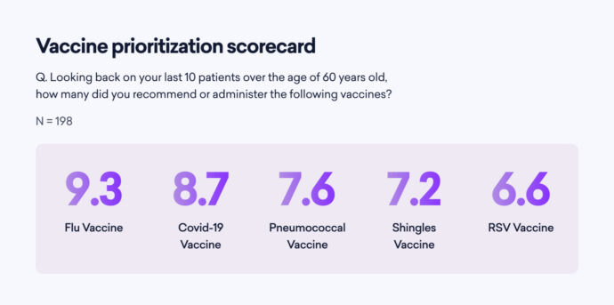 When it comes to recommending or administering vaccinations for patients over 60, HCPs have a clear scoreboard. Flu and Covid-19 vaccines take the lead, scoring 9.3 and 8.7 out of 10 respectively. While new to the game, the RSV vaccine is on the team but not yet stealing the spotlight with a modest 6.6 out of 10.