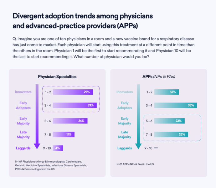 As a wave of new respiratory vaccines enter the market, Sermo’s survey found there are some key differences between physicians and advanced practice providers (APP), including Nurse Practitioners and Physician Assistants, when they adopt new vaccines into their practice. 62% of physicians self-identified as innovators – early adopters, while 49% of APPs lean more towards the early-late majority when adopting a new vaccine brand into their practice.