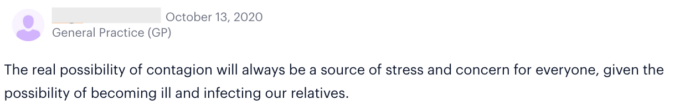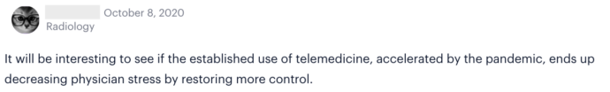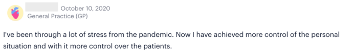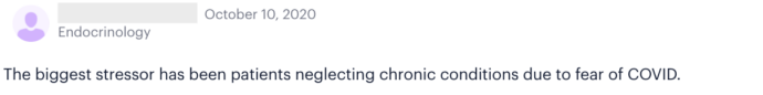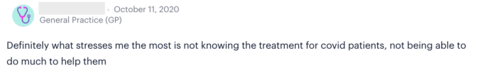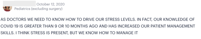However, recent poll results reveal Sermo physicians have improved stress levels. In March, Sermo polled 20,000+ global physicians on the state of their mental health: 71% reported moderate – extreme stress levels for themselves. But in a recent October poll of 1,900+ Sermo physicians, only 58% said they are feeling moderate – extreme stress. In addition, physicians said the Covid-triggered stress factors—such as higher patient volume, financial concerns, new processes for seeing patients in-office, uncertainty in how to treat Covid patients—are less stressful now.