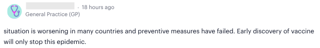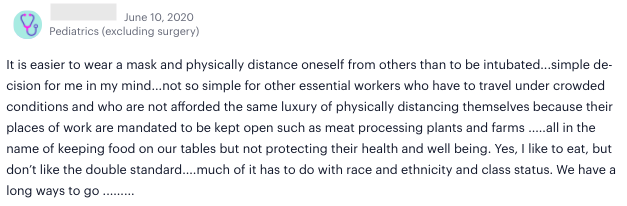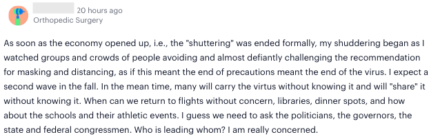 In related news, the W.H.O. reported that asymptomatic transmission of Covid-19 is not a significant factor, which 76% of Sermo physicians did not agree with. In order to truly move forward safely, 92% of physicians said we need a clearer grasp on how Covid-19 is transmitted, according to our poll. Here are some more opinions that Sermo physicians expressed: