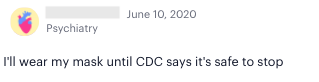 In another poll, 88% of Sermo physicians said they believe their patients are confused on how to safely resume normal life and 85% fear this confusion and the need for normalcy and social interaction could trigger another wave of the coronavirus. When asked about how long they plan to continue to wear masks, 14% said for at least the next month; 25% said for at least the next 3 months; 30% said for at least 6 months; and 19% said for at least a year.
