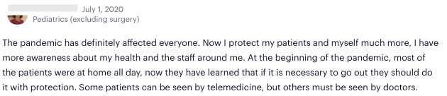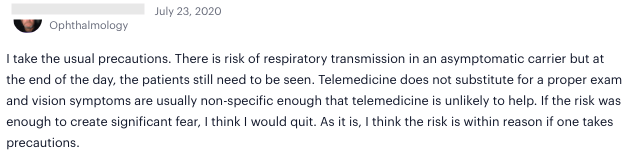 While 79% of Sermo physicians have resumed in-person appointments, and 93% have adopted precautionary measures, such as mask-wearing, frequent sanitizing, and 6-foot distancing in the office—61% of physicians still feel anxious about the exposure they face when seeing patients in person. Here’s more of what Sermo doctors are saying on this topic: